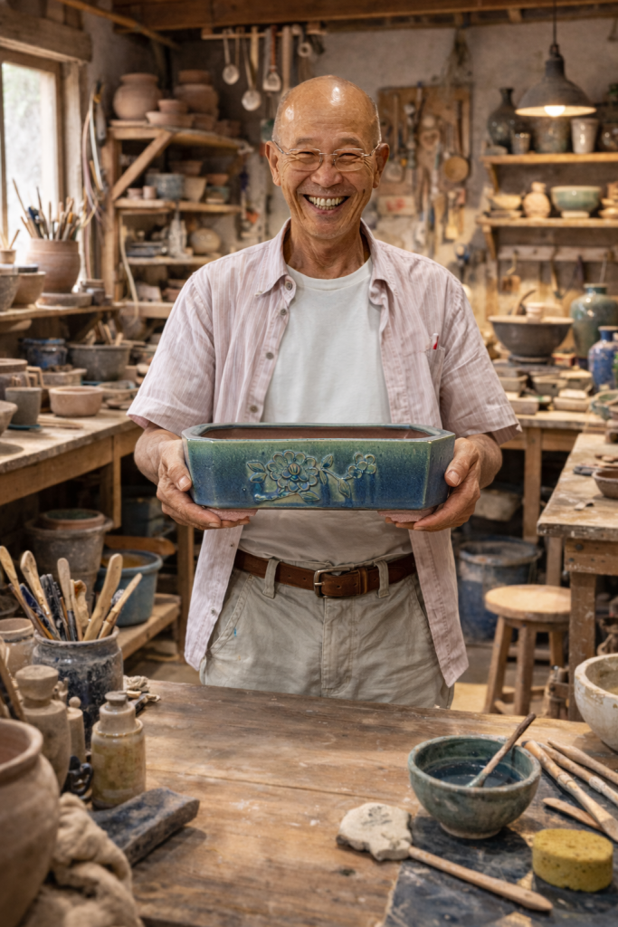 Sus macetas destacan por unas proporciones impecables, concebidas no sólo para contener, sino para acompañar con discreta elegancia los estilos y especies más comunes del bonsái. No hay en su obra nada casual: todo responde a una sensibilidad cultivada, a una mirada profunda sobre el arte, la naturaleza y la armonía entre ambos.