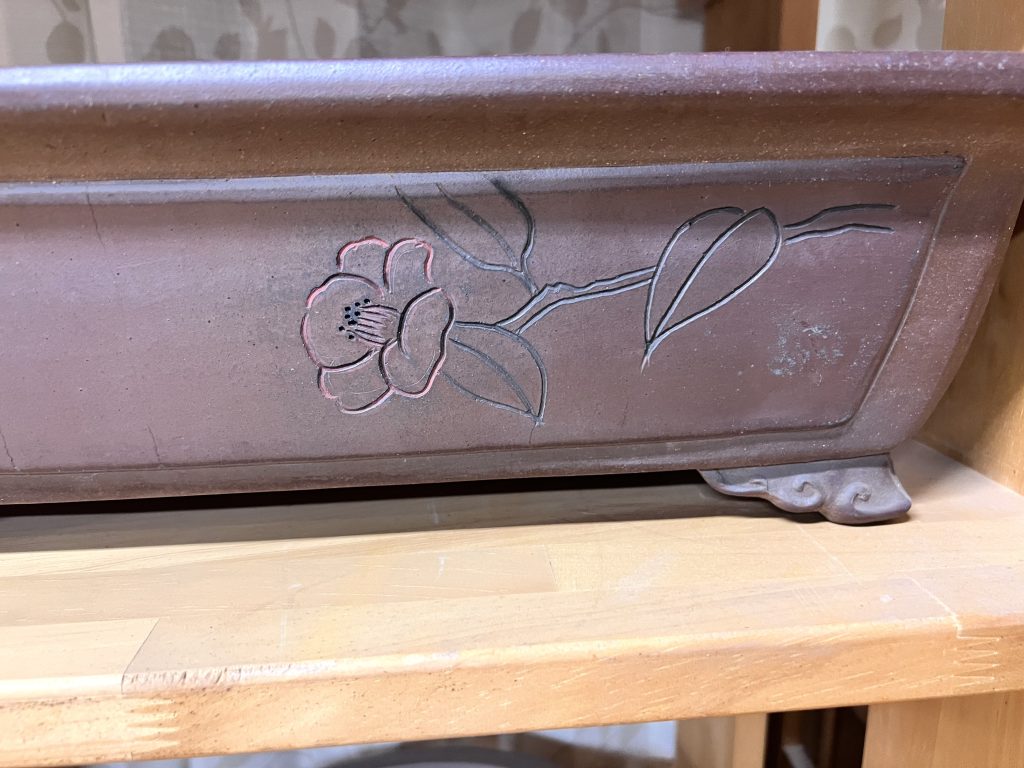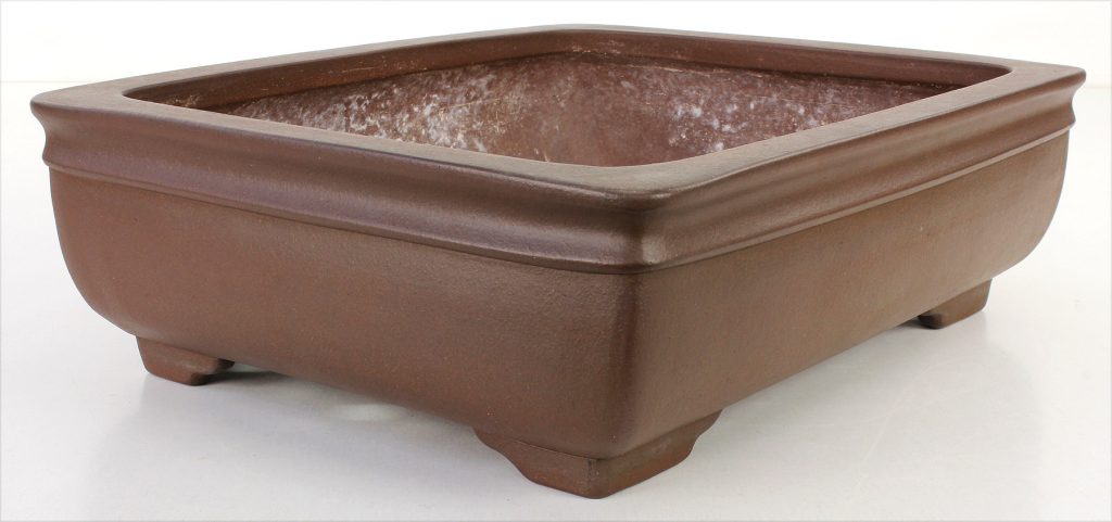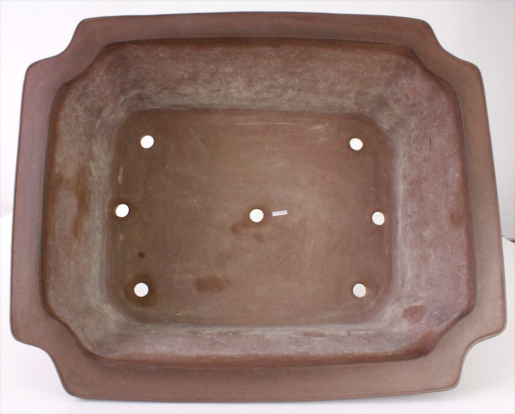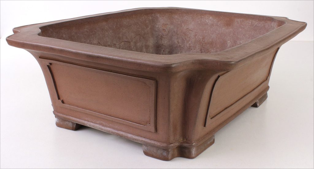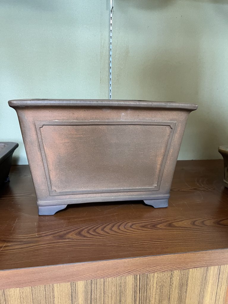 Otra maceta de Yuuji, en esta ocasión uno de los diseños más solicitados en la actualidad. Destaca por el carácter de los paneles o recuadros del cuerpo —denominados tanijaku— y por sus esquinas recortadas con escotadura en “U”, un detalle que aporta dinamismo y personalidad a la pieza.