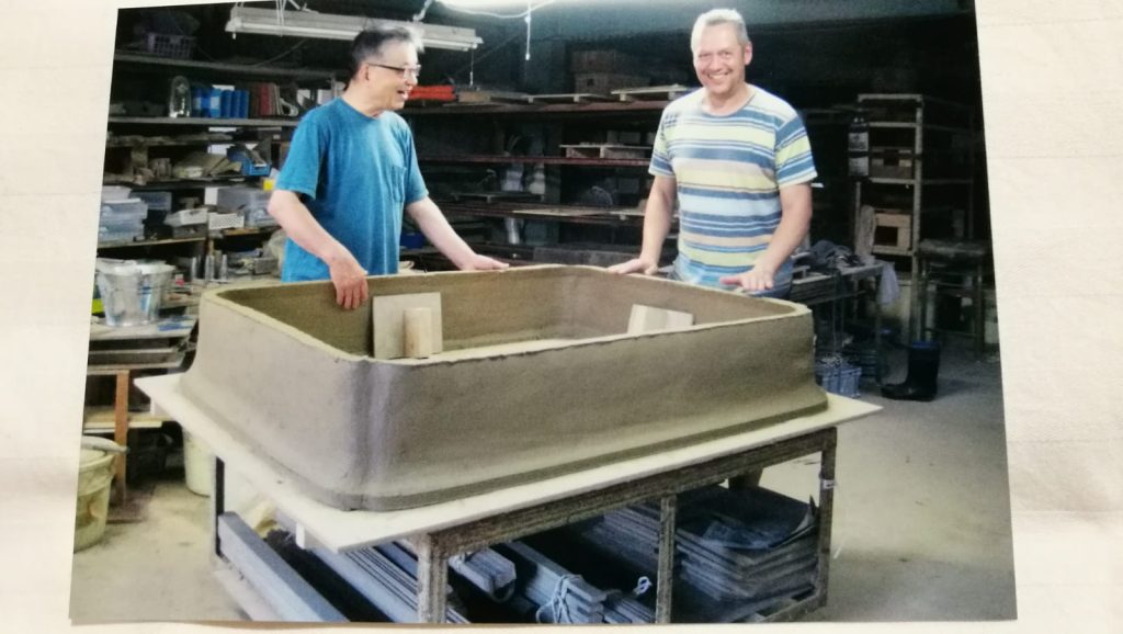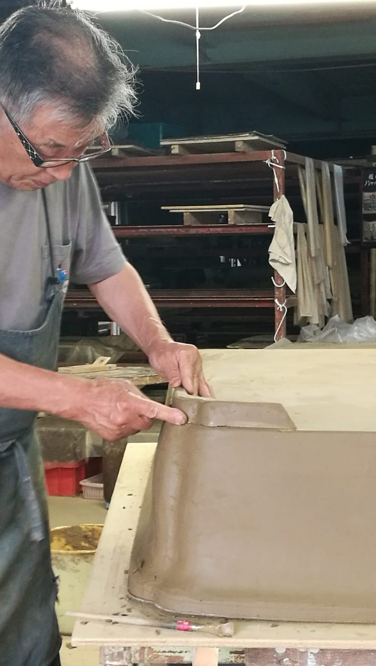 El progreso fue pausado pero firme. Siempre tuvo presente todo lo que le quedaba por aprender. El punto de inflexión llegó cuando decidió viajar a Japón para formarse con Nakano. Al llegar al taller se encontró con una maceta de gran tamaño en proceso de construcción, destinada a albergar una azalea monumental. La pieza se trabajaba por fases: se modelaba, se cubría con plástico para controlar el secado y se retomaba al día siguiente. Nakano había levantado primero las paredes y mantenía el fondo, una gran plancha de barro, preparado aparte para incorporarlo después.