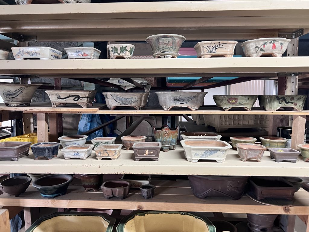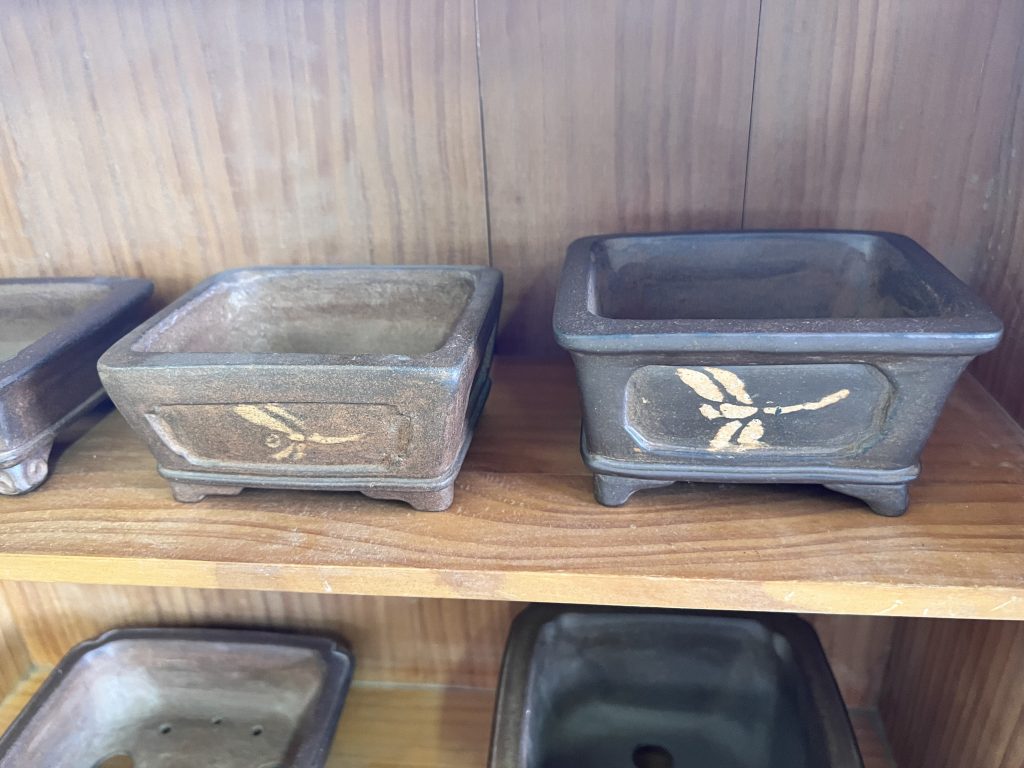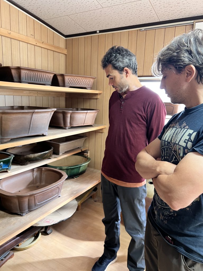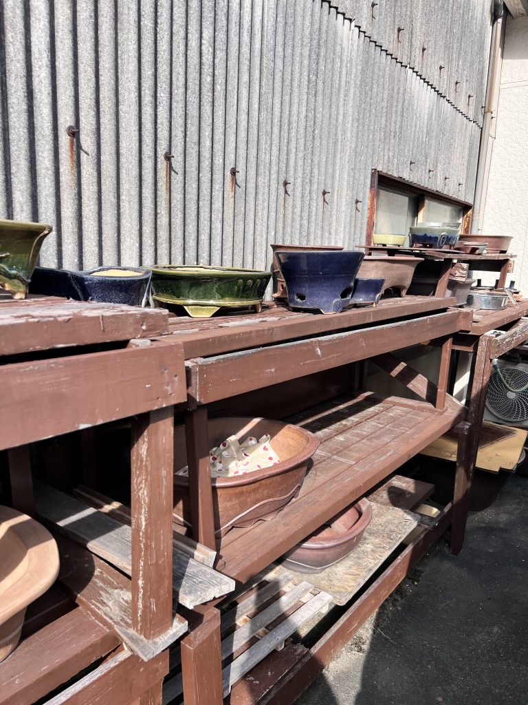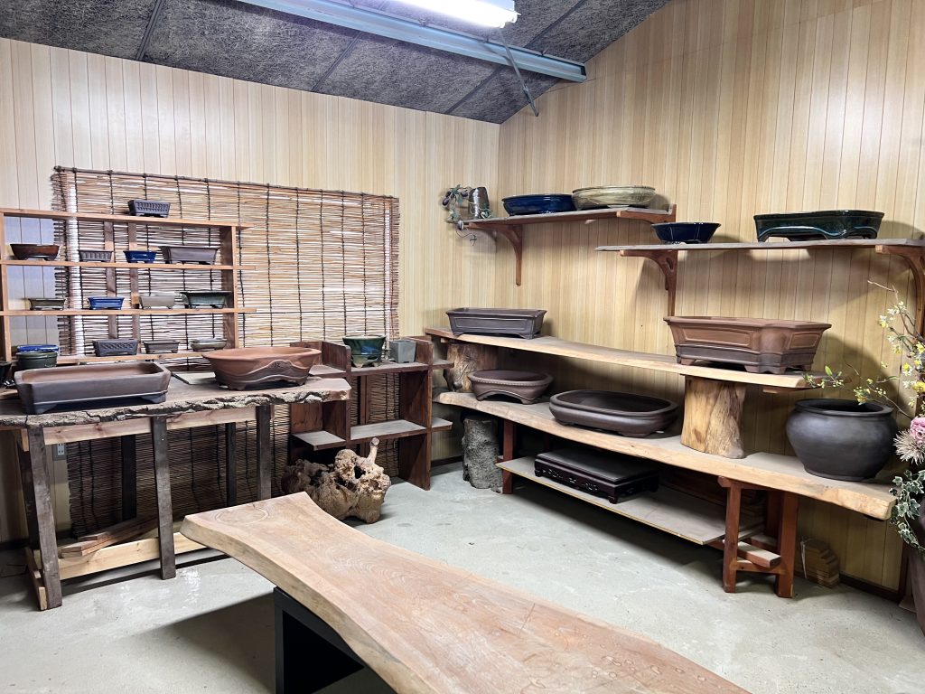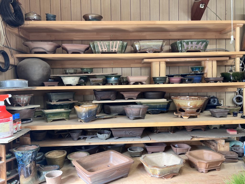 Antes incluso de cruzar el umbral del taller, la mirada se detiene inevitablemente en el jardín de Nakano. Es un espacio discreto y sereno donde el maestro da rienda suelta a su pasión por el bonsái. Sus árboles, cuidadosamente cultivados aunque todavía poco trabajados en su formación, conviven con plantas de acento y ornamentales que completan el conjunto. Sin embargo, son las macetas —auténticas creaciones del maestro— las que sobresalen con particular fuerza: en ellas se manifiesta de manera más elocuente su talento y su inconfundible sensibilidad artística.