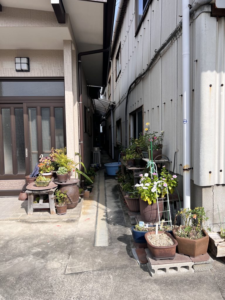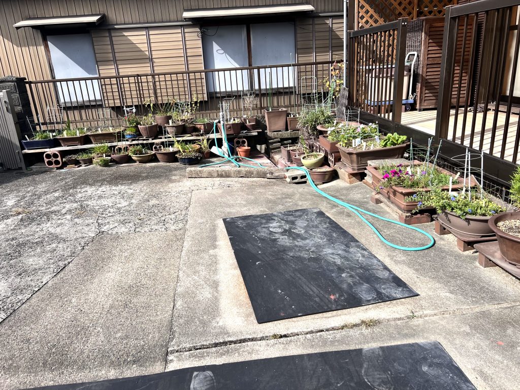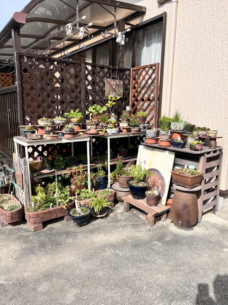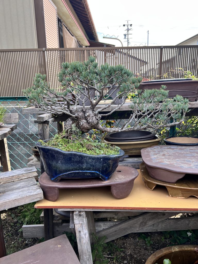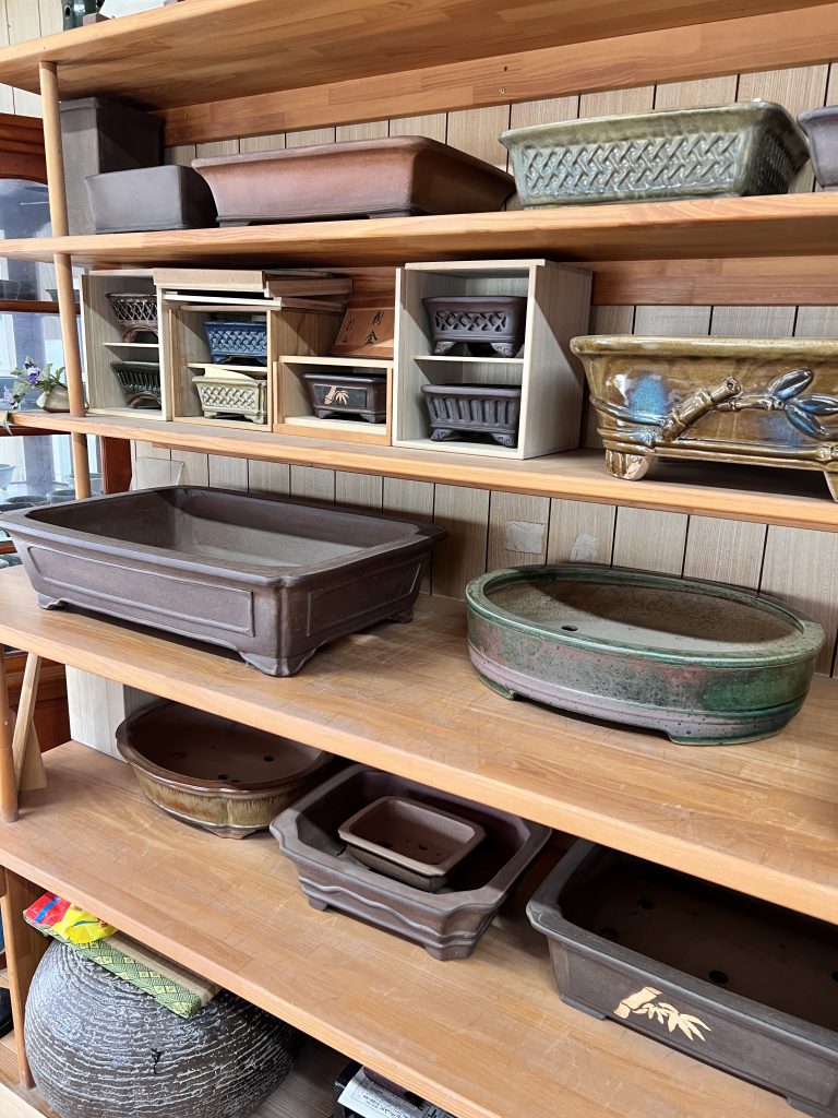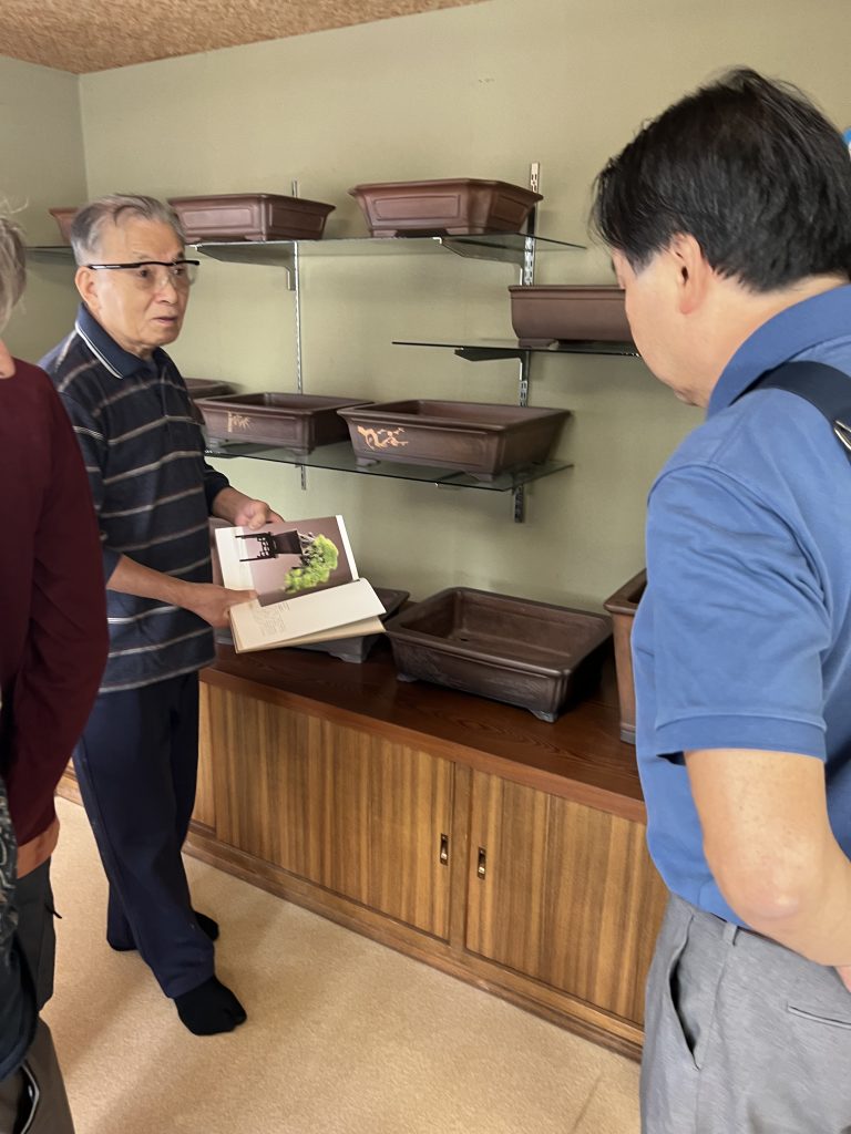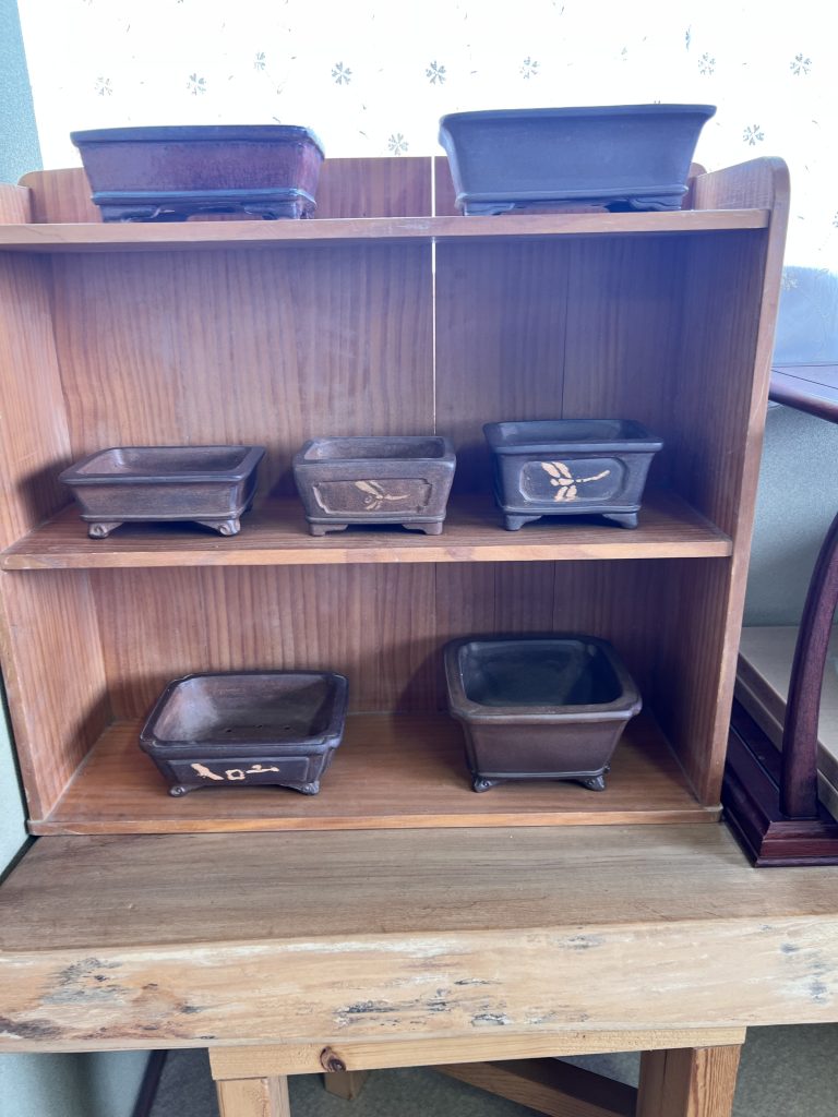 Antes incluso de cruzar el umbral del taller, la mirada se detiene inevitablemente en el jardín de Nakano. Es un espacio discreto y sereno donde el maestro da rienda suelta a su pasión por el bonsái. Sus árboles, cuidadosamente cultivados aunque todavía poco trabajados en su formación, conviven con plantas de acento y ornamentales que completan el conjunto. Sin embargo, son las macetas —auténticas creaciones del maestro— las que sobresalen con particular fuerza: en ellas se manifiesta de manera más elocuente su talento y su inconfundible sensibilidad artística.