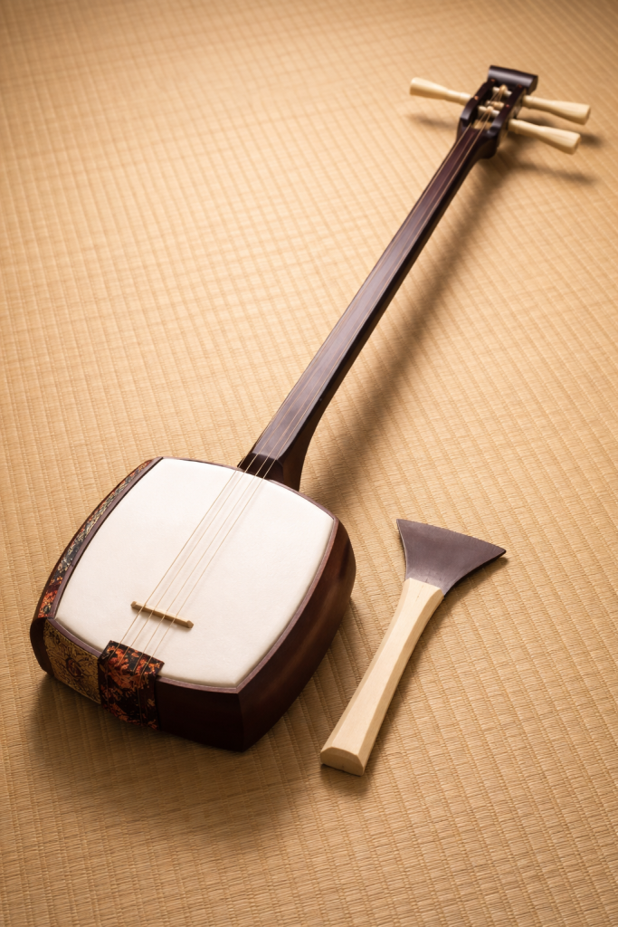 Se toca con una púa grande llamada bachi y se utiliza tanto en la música popular como en el teatro japonés, especialmente en el kabuki y el bunraku.