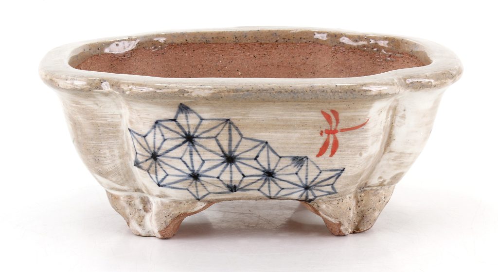 Una elegante maceta de tamaño Shohin, firmada por Nakano Yukizou y decorada por Eiko con delicados motivos geométricos y libélulas. Esta pequeña pieza, de forma mokko, nos acompañó de regreso a Madrid en nuestro último viaje a Tokoname. Pertenece a la colección Laos Garden.
