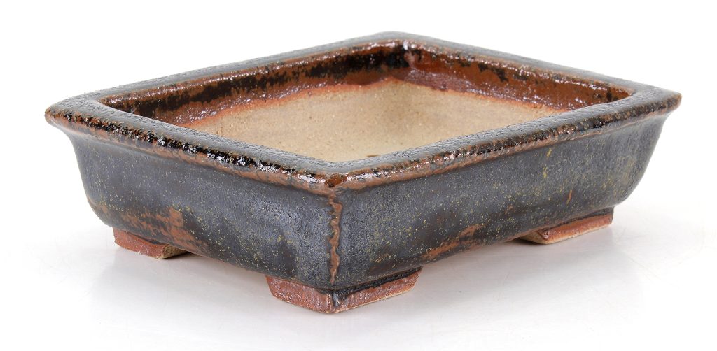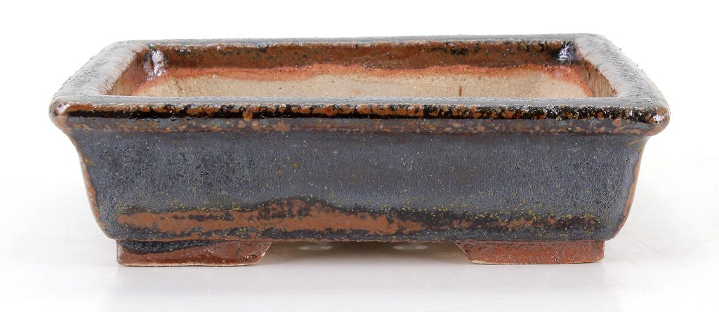 Por su parte, el esmalte Namako (namako-yū) —a veces descrito como “esmalte de pepino de mar”— es uno de los acabados más apreciados en la cerámica japonesa, especialmente en macetas para bonsái y piezas vinculadas al arte del té. Se reconoce por sus profundos tonos azulados o violáceos, salpicados de matices irregulares en blanco, beige o marrón, creando una superficie vibrante y orgánica que evoca la textura marina de la que toma su nombre.